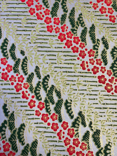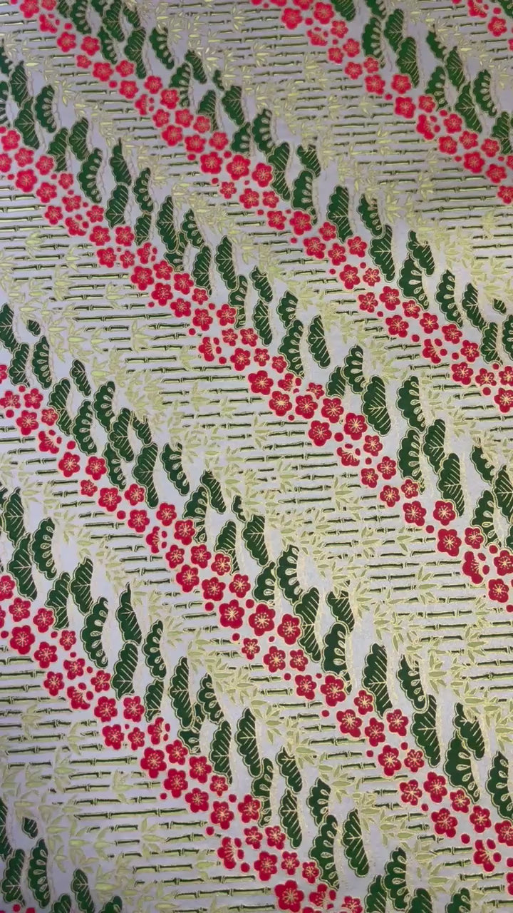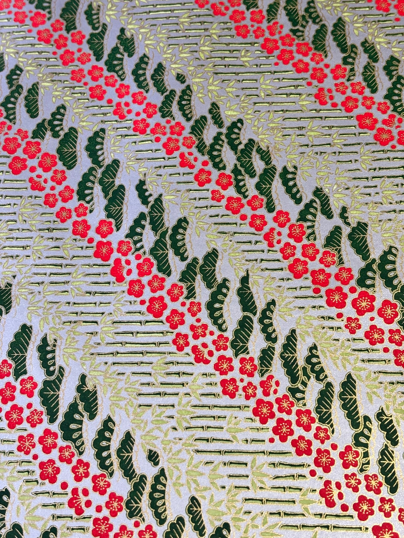 This vibrant Japanese Yuzen Chiyogami Washi Paper design, KW119, features an exquisite scene of bright red plum blossoms intertwined with lush green bamboo stalks and fan-shaped leaves. Accented with shimmering gold outlines against a soft silver background, this design captures the essence of traditional Japanese elegance. Ideal for origami, card making, gift wrapping, scrapbooking, and other decorative projects.