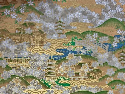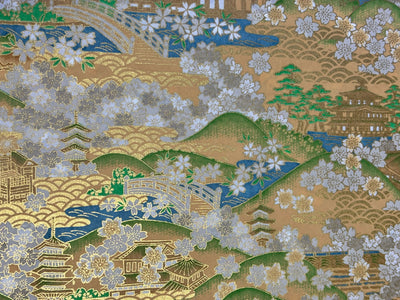 This stunning design showcases a traditional Japanese landscape adorned with golden pagodas, bridges, and rivers, all surrounded by soft rolling hills and delicate cherry blossoms. The artwork is enriched with gold and silver metallic accents that bring a sense of luxury and timeless elegance. A beautiful choice for decorative projects or elegant origami creations.