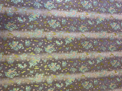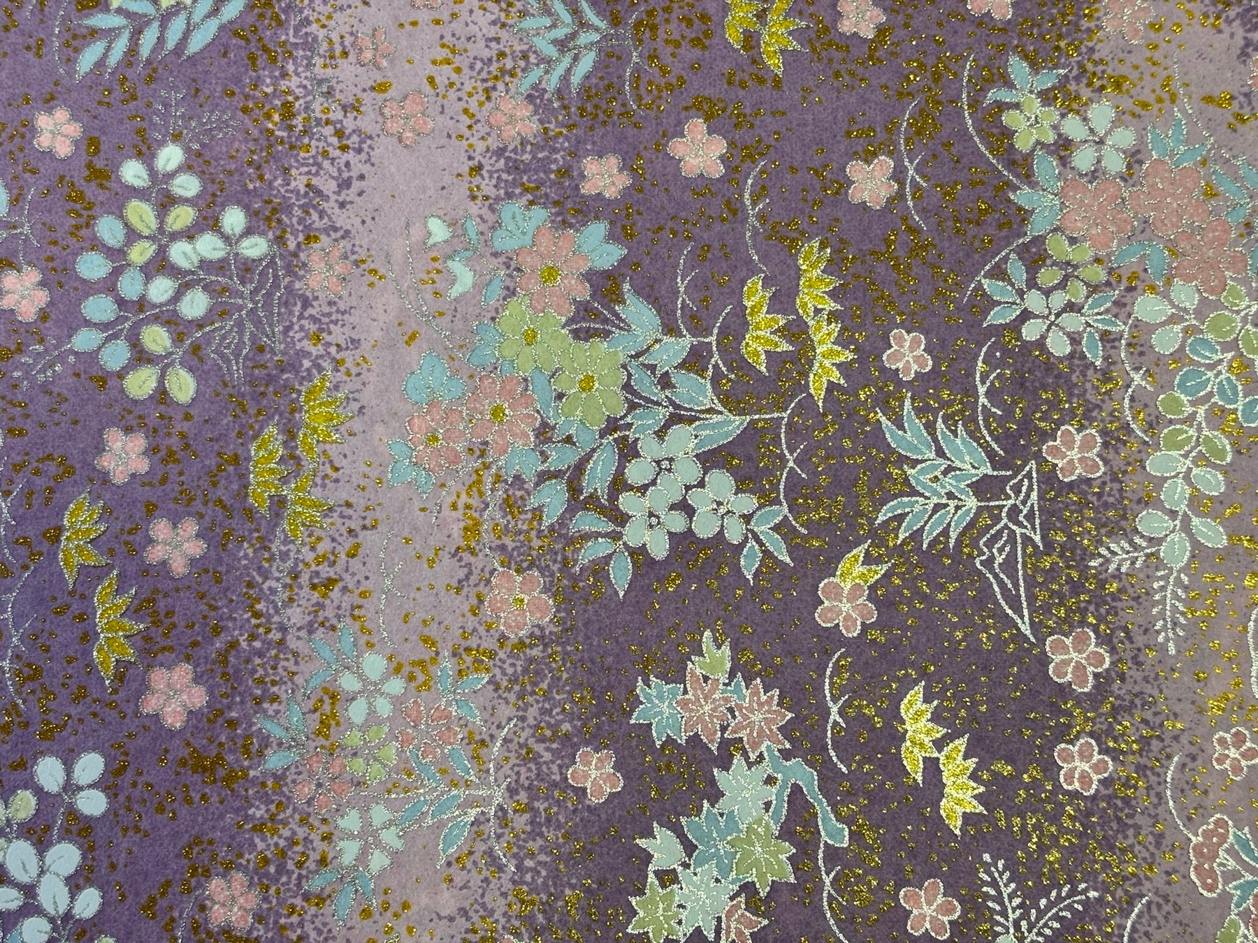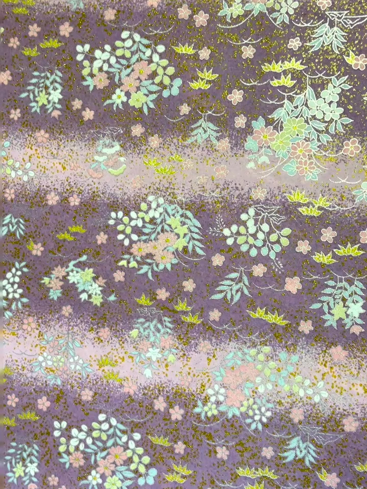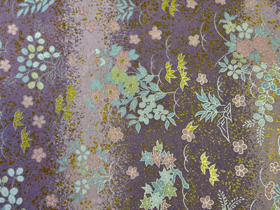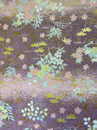 This exquisite Japanese Yuzen Chiyogami paper showcases a graceful floral vine pattern set against a soft purple gradient background. The design features pastel shades of blue, pink, and green accented with fine gold detailing, creating a luxurious, dreamy effect. Ideal for origami, card making, scrapbooking, and other paper crafts.