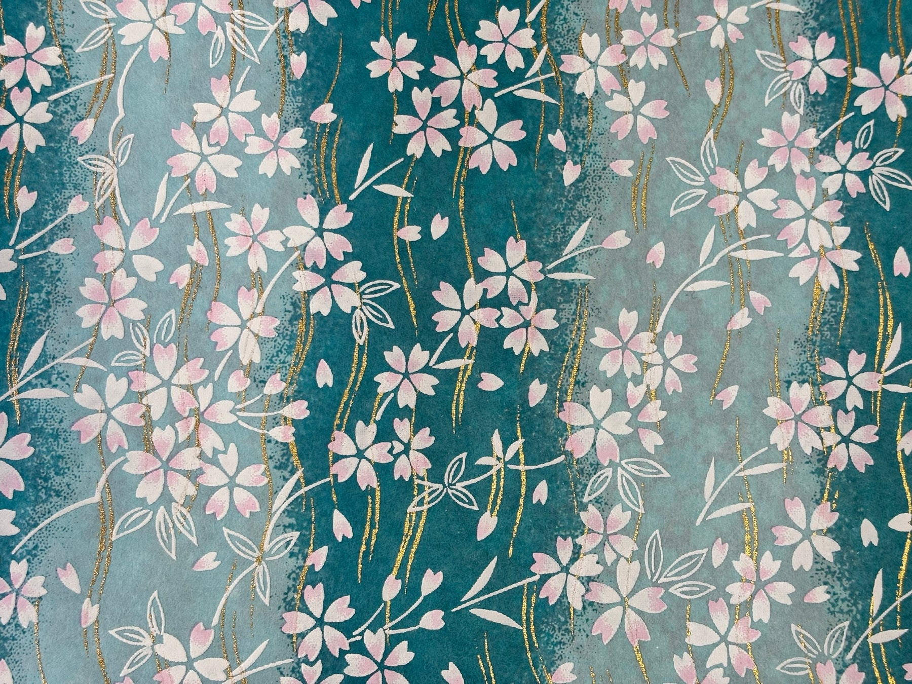 This beautiful washi paper features delicate pink sakura blossoms cascading across tranquil aqua waves. The swirling background is accented with shimmering gold strokes, creating a gentle sense of movement and elegance. Perfect for spring-themed origami, journaling, card making, and decorative crafts.