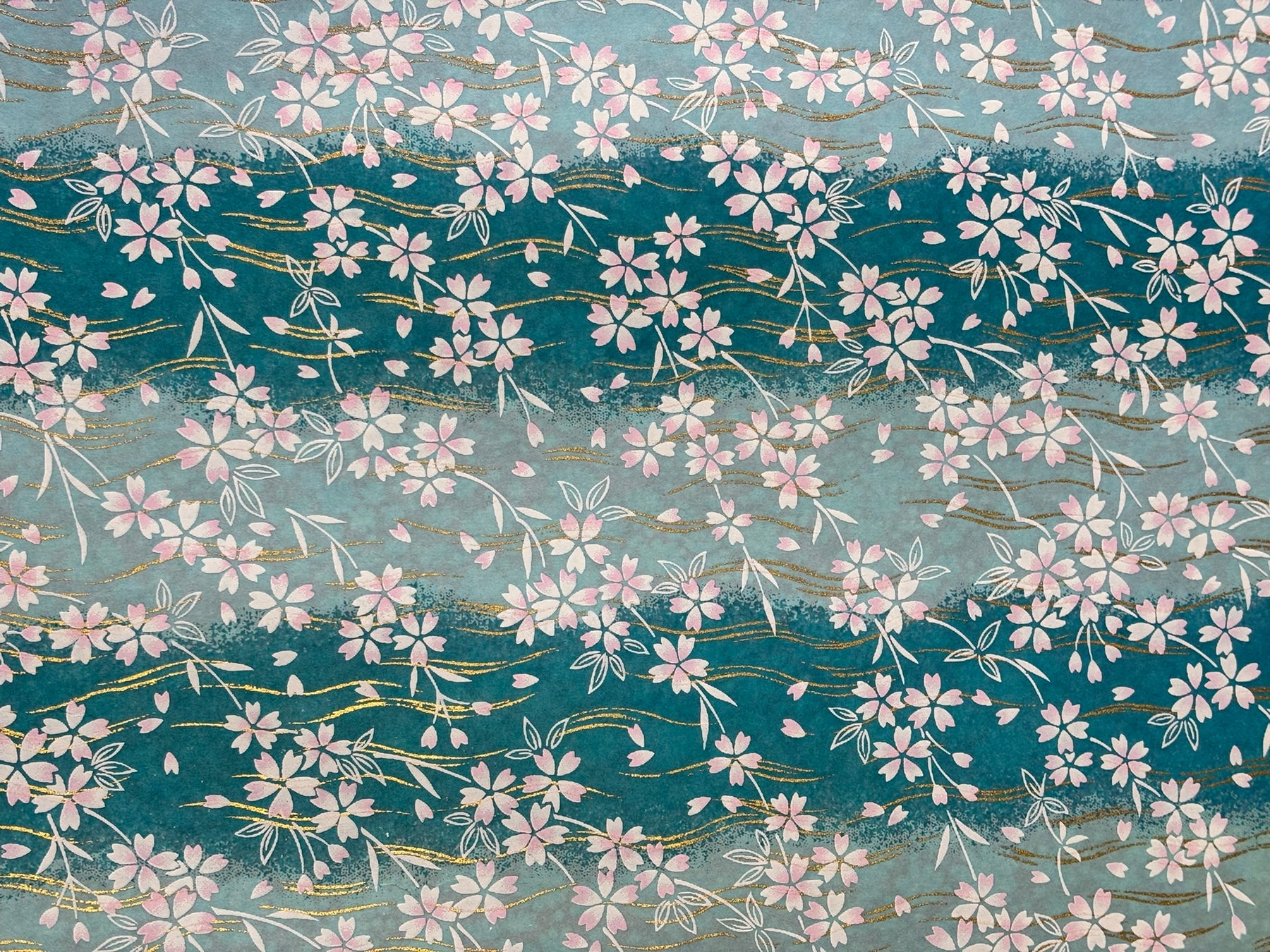 Japanese Yuzen Chiyogami Washi Paper – KW125 – Pink Sakura Blossoms on Aqua Waves