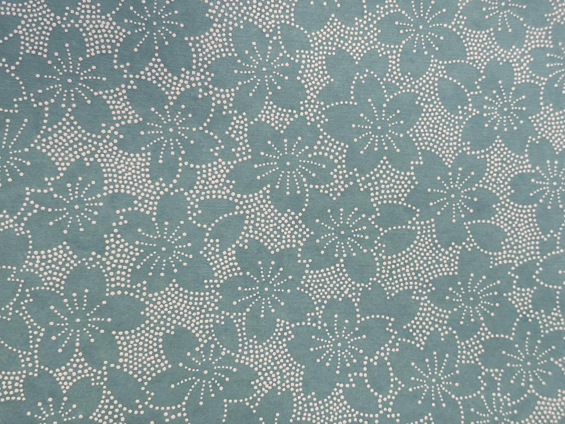 This Japanese Yuzen Chiyogami Washi Paper features a delicate dotted sakura (cherry blossom) design printed on a soft teal background. The fine dot work outlines each petal and adds subtle texture, making this paper ideal for projects that require a more understated elegance. Perfect for card making, invitations, scrapbooking, origami, and gift wrapping.