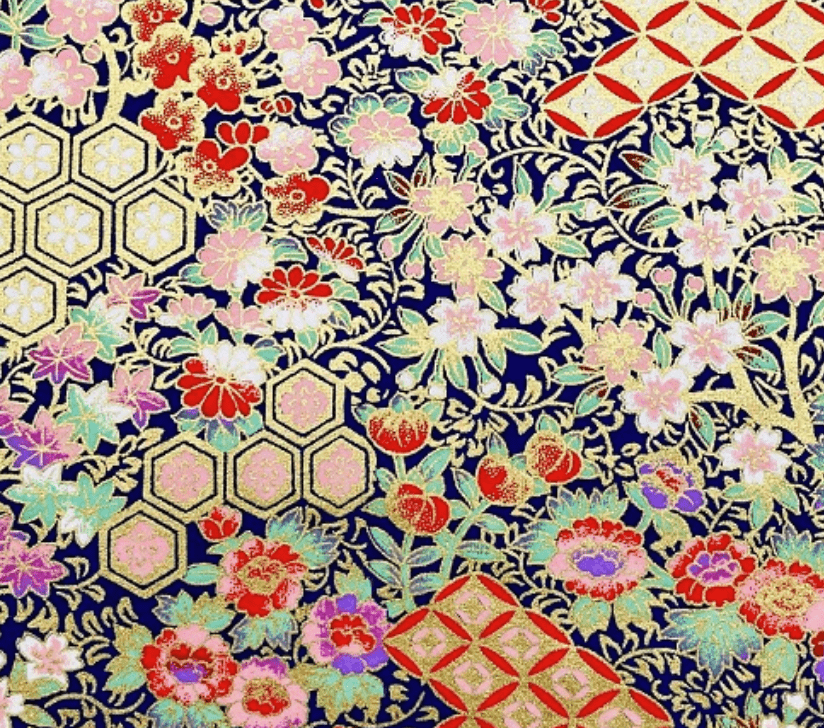Japanese Yuzen Washi Paper Y1232 – Floral & Geometric Motifs on Navy with Gold Chiyogami