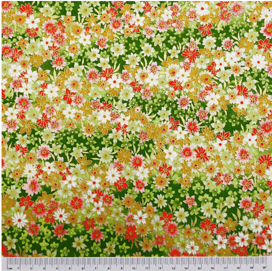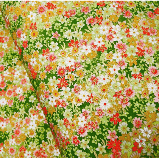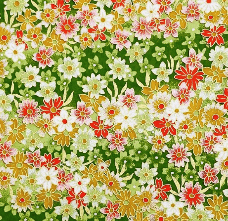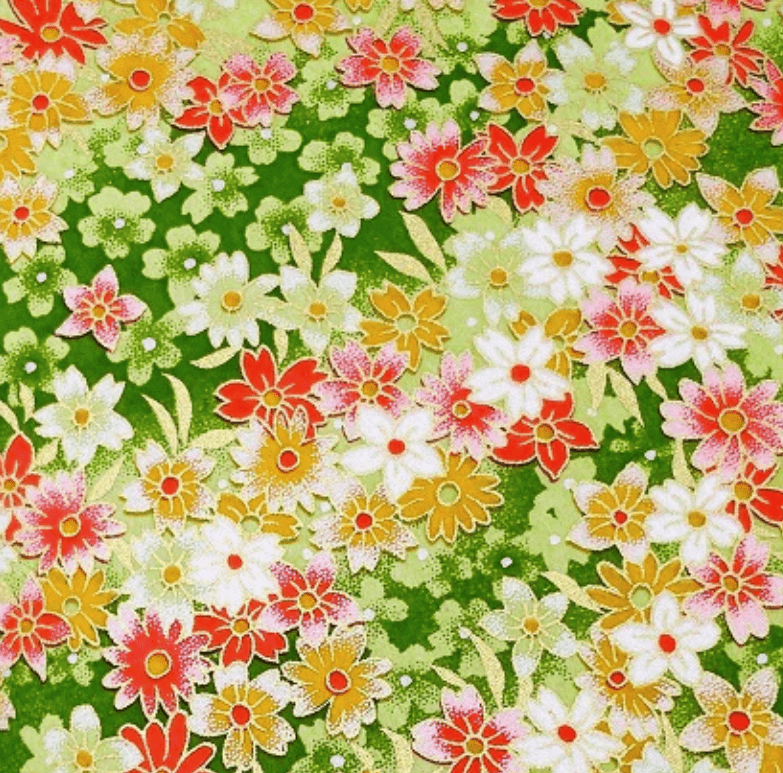 This vibrant Japanese Yuzen washi paper Y1262 floral chiyogami features a rich green background covered with a carpet of tiny flowers in red, white, soft pink and golden yellow. Layers of light green leaves and gold-style outlines give the design a fresh, lively feel, like a spring garden in full bloom.
