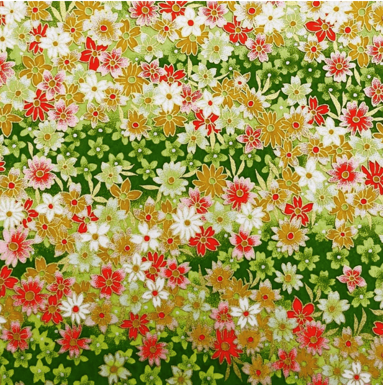 Japanese Yuzen Washi Paper Y1262 – Red, White & Gold Flowers on Green Chiyogami