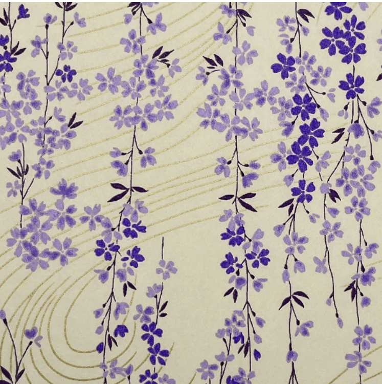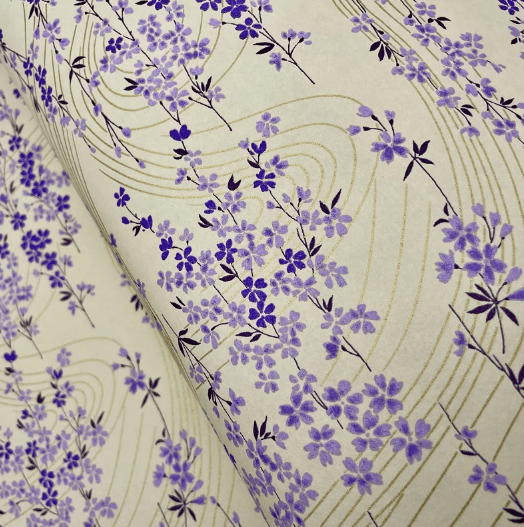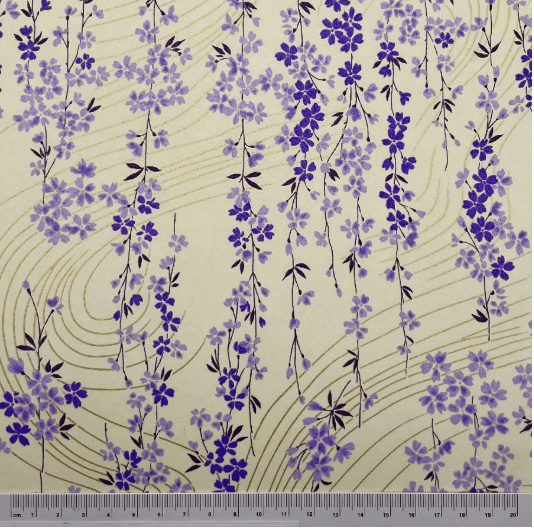 Yuzen washi is created using traditional Japanese printing techniques, resulting in rich colour, crisp pattern detail and a beautiful tactile finish. With its calm cream ground, cool purple tones and subtle gold movement, this Y1175 design is perfect for projects that need a refined, tranquil floral look.
