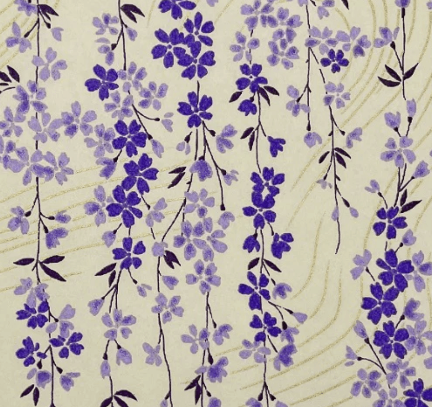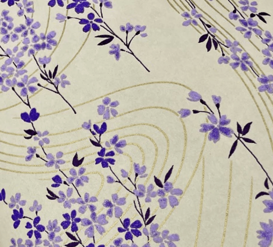 Japanese Yuzen Washi Paper Y1175 – Lilac & Purple Blossoms on Cream with Gold Streams Chiyogami