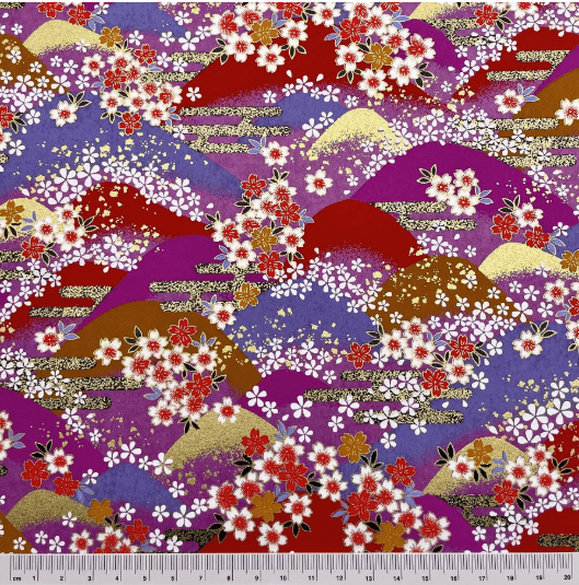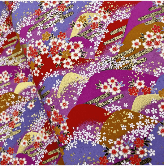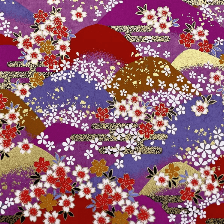 This Y1196 magenta and purple floral landscape Yuzen washi is wonderful for folding striking origami models, creating bold Japanese-inspired greeting cards, decorating journals, or adding a rich, celebratory touch to your next creative project. The combination of layered hills, blossoms and gold-style highlights makes every piece feel luxurious and full of energy.
