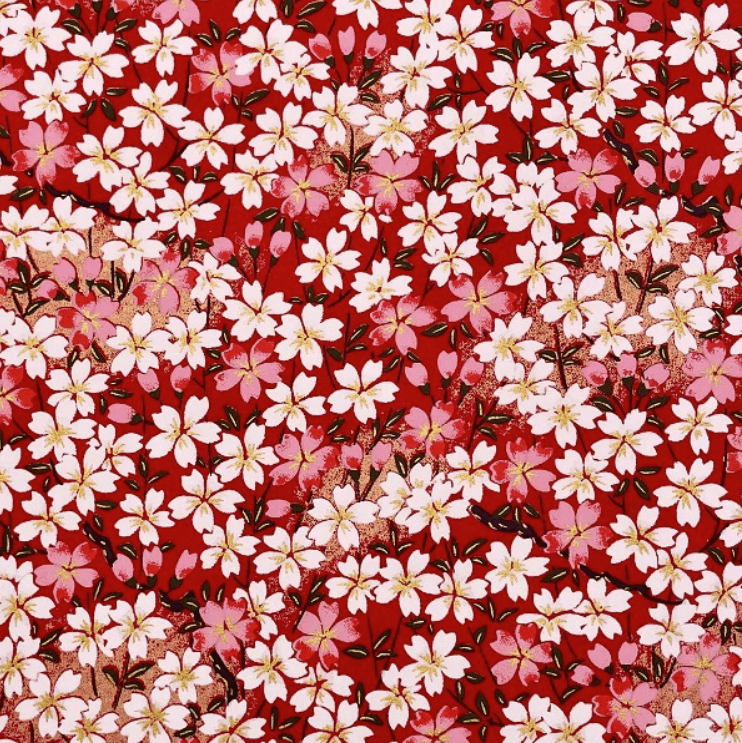 Yuzen washi is created using traditional Japanese printing techniques, resulting in vivid colours, crisp pattern detail and a beautiful tactile finish. With its bold red ground and classic cherry blossoms, this Y1242 design is perfect for romantic, festive and Japanese-themed projects.